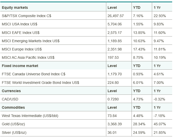Global equity markets declined over the week ended June 20. World leaders gathered in Alberta, Canada, for the G7 summit to discuss global trade and security as the conflict continued in the Middle East. U.S. President Donald Trump left the summit early to address matters connected to the conflict. In Canada, the S&P/TSX Composite Index finished relatively flat, brought down by the Materials sector. U.S. equities declined, despite gains in the Information Technology and Energy sectors. Yields on 10-year government bonds in Canada and the U.S. declined. The price of oil increased over the week, with market volatility driven by tense Middle East geopolitics.